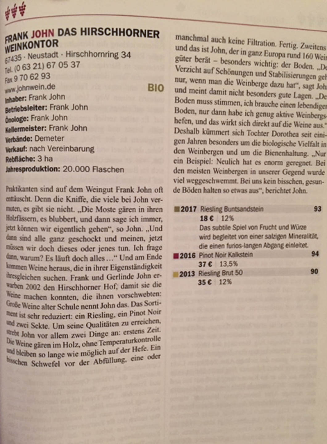 „Größe ist nicht immer die Antwort. Manchmal sind es die Perlen in der Menge, dies es lohnt aufzustöbern, auch wenn sie so ganz anders sind als die Drumherum …. Frank Johns Weine erfordern eine gewisse Aufmerksamkeit, denn sie locken nicht mit den gängigen Pfälzer Reizen. Er geht dabei so vor, wie dies einstmals üblich war und heute von den Topbetrieben wieder eingeführt ist: pingelig arbeiten bis ins Extrem, um nur bestes Lesegut zu erzielen – und dann im Keller so gut wie nichtsmehr zu tun. …“